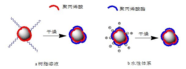 HT A20分子中的錨固部分由(甲基)丙烯酸、磷酸的均聚物或共聚物組成,通過和鈦白粉間的吸引力(配位作用、共價(jià)鍵)吸附在粒子表面,將粒子隔離開來。和樹脂相容的穩(wěn)定部分由丙烯酸酯、甲氧基聚丙二醇丙烯酸酯無規(guī)共聚物組成,賦予表面改性后的鈦白粉粒子良好的再分散性,并且能穩(wěn)定均勻分散在樹脂溶液和溶劑揮發(fā)后的樹脂中。在體系干燥過程中以及干燥后,和樹脂相容的部分能包覆在鈦白粉粒子表面,防止粒子聚集,使得鈦白粉粒子在樹脂中能均勻分散。圖2表示改性劑HT A20處理鈦白粉粒子后,HT A20在粒子表面的形態(tài)。圖2a表示在樹脂溶液或溶劑中,干燥前,改性劑的錨固部分和鈦白粉粒子間通過共價(jià)鍵、配位鍵結(jié)合在粒子表面上,聚丙烯酸酯部分充分伸展,通過空間位阻作用穩(wěn)定粒子;干燥后,聚丙烯酸酯部分包覆在粒子上或和樹脂基體互相滲透。圖2b表示在水性體系中,干燥前,改性劑的聚丙烯酸錨固部分和鈦白粉粒子間通過共價(jià)鍵、配位鍵結(jié)合在粒子表面上,依靠靜電斥力穩(wěn)定粒子;干燥后,聚丙烯酸酯部分包覆在粒子上或和樹脂互相滲透??梢?,雙親型嵌段聚合物改性劑HT A20對(duì)鈦白粉進(jìn)行有機(jī)表面處理后,在有機(jī)溶劑體系和水性體系中,都能提高鈦白粉在介質(zhì)中的分散穩(wěn)定性并改善鈦白粉和樹脂的相容性。